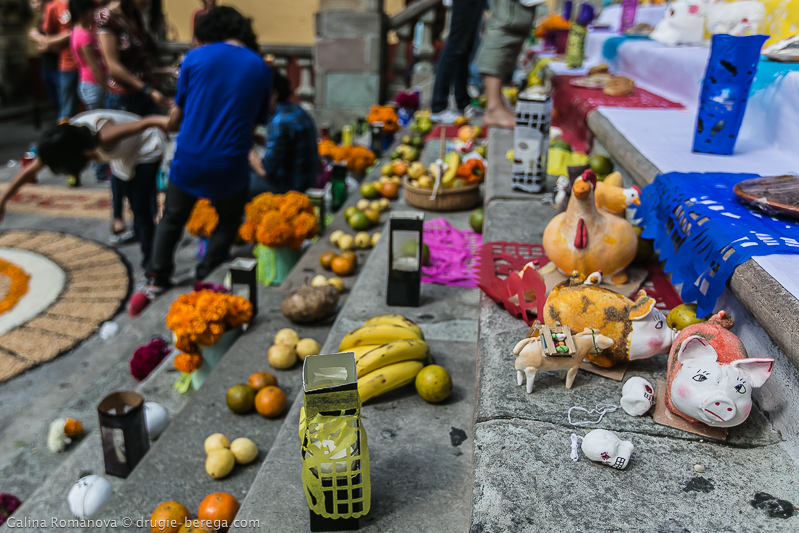 Мексиканцы верят, что во время празднования Дня мертвых загробный мир оживает, а души умерших получают возможность посетить свой дом и родных. Именно поэтому в каждом доме в преддверии праздника устраивается алтарь смерти — небольшой постамент, на котором размещаются подношения умершим родственникам. Здесь можно найти и угощения, и выпивку, и вещи, которые были любимы ими при жизни, ну и конечно же расписные черепа, цветы и свечи.