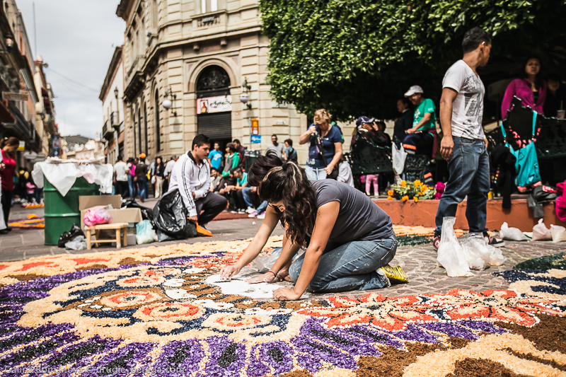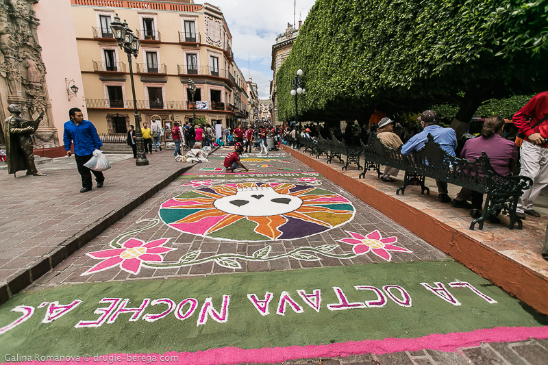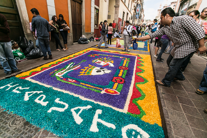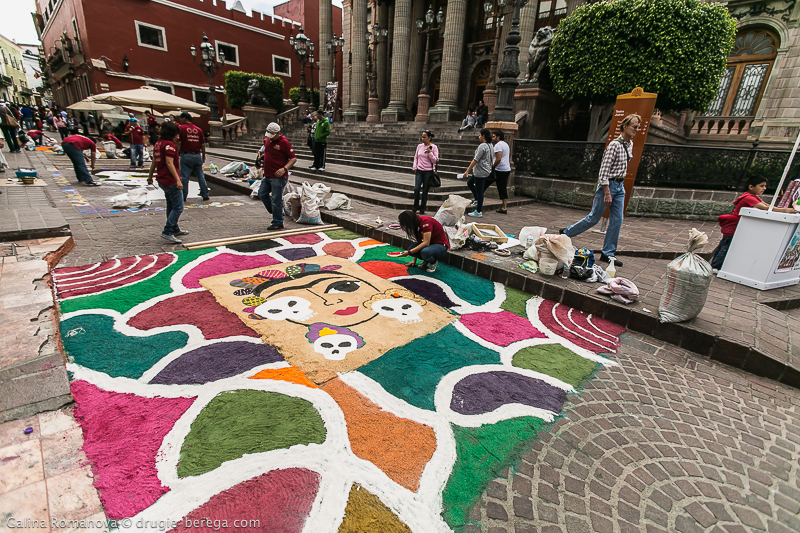 Помимо карнавального шествия в Мексике есть еще один особый ритуал – рассыпчатые картины. С раннего утра собирается молодежь, стаскивающая мешки, набитые разноцветными сыпучими материалами — крупой, опилками, горохом, солью, песком, из умелого сочетания которых спустя пару-тройку часов на мощеной поверхности улиц появляются настоящие произведения искусства. Основная тема создаваемых таким образом картин, конечно же, смерть и все, что с ней связано: черепа, скелеты, Катрина и даже знаменитая Фрида Кало. И этих картин создается ни одна, ни две, а десятки — так, что глядя вглубь улиц, им не видно ни конца, ни края.