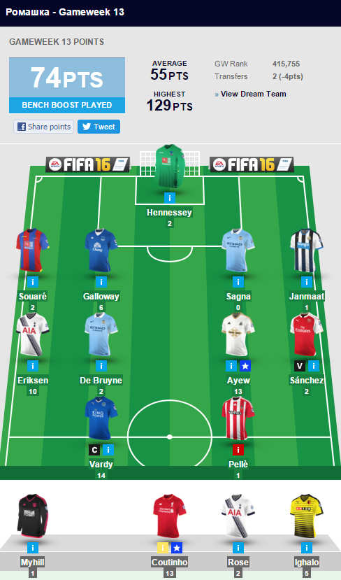Я увидел хорошую возможность использовать Bench Boost и в принципе остался доволен. Если бы Хеннесси и Суаре удержали клиншит, тур бы окончательно удался, но и так вышло вполне неплохо. От Пелле уже избавился, в Санчеса продолжаю верить.