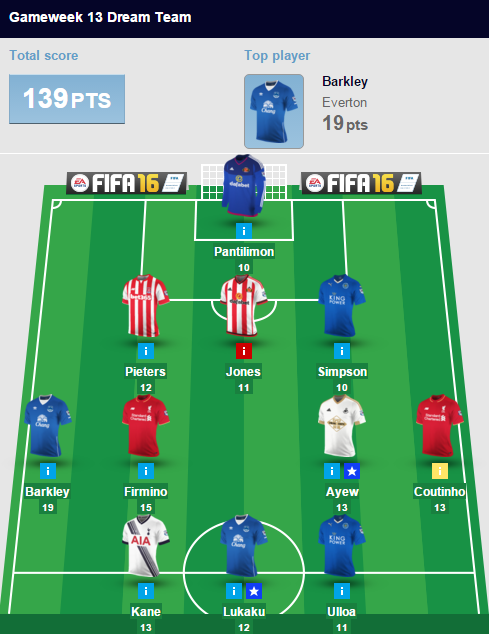 Почти все лучшие игроки тура уже были упомянуты. Роберто Фирмино в отсутствие Бентеке и Старриджа получил шанс порезвиться в атаке и максимально его реализовал. Леонардо Ульоа второй раз в сезоне вышел в основе и сразу оформил гол+пас+бонус. Костел Пантилимон — один из главных творцов выездного клиншита «Сандерленда». На счету вратаря 7 сэйвов и 2 бонусных очка.