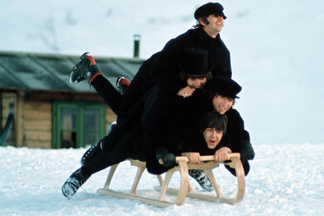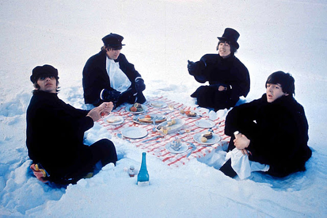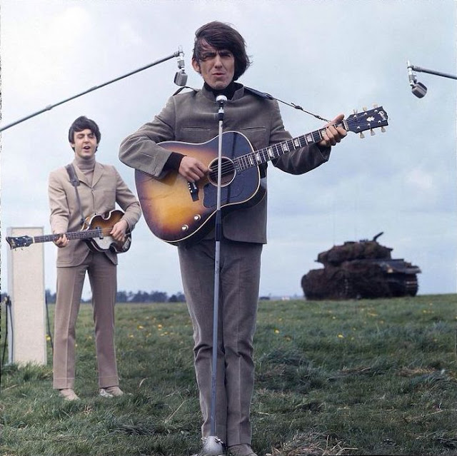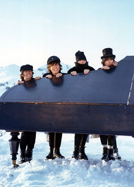 Несколько фотографий "The Beatles", играющих и позирующих во время съёмок фильма "Help" в 1965 году.