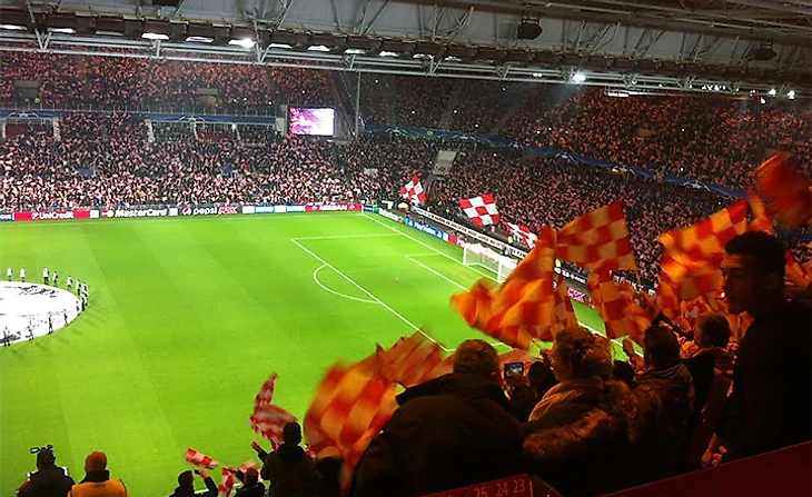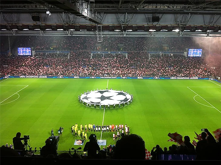 ПСВ вышел на разминку раньше ЦСКА, а закончил ее позже. В вип-ложе мелькнули Данни Блинд и Гус Хиддинк, а на гостевом секторе – баннер польского «Видзева». Минут за пять до начала тридцать пять тысяч болельщиков ПСВ достали флажки в красно-белую клетку и вдохновенно предварили игру.
