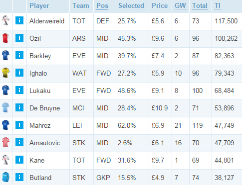24 очка за последние 3 тура и приятный календарь сделали Тоби лидером топа покупок на этой неделе. Сразу за ним — суперстабильный Озил. Лидеры «Эвертона» Баркли и Лукаку совсем рядом. Здесь же и бесноватый форварда новичка АПЛ Игало, продолжающий радовать успехами у чужих ворот. Невнятный матч со «Стоком» не смутил поклонников Кевина де Брюйне. Голевая феерия Мареза в прошлом туре склонила еще пачку менеджеров в сторону полузащитника «Лестера». «Сухая» победа над «Ман Сити» — достойный аргумент для покупки Батленда и Арнаутовича. Кейн два матча подряд уходит с поля без гола и с желтой карточкой, но это мало волнует 44 801 менеджера.