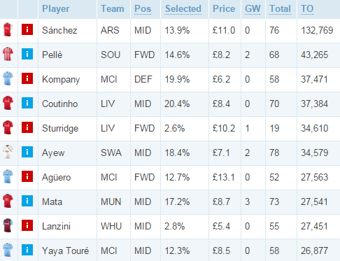 Санчес, Компани, Старридж, Агуэро и Лансини попали в топ продаж из-за травм. Появление в списке продаваемых игроков Коутиньо — это также следствие травмы бразильца. Андре Айю растерял форму вместе с «Суонси», Мата — вместе с «МЮ», а Пелле больше не кажется качественной атакующей опцией, когда есть Лукаку, Игало и Варди. Старого доброго Яя Туре мы, похоже, больше не увидим, а ведь были времена...