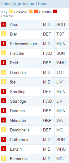 Не унывайте те, кто преждевременно поверил в возвращение Дэниэла Старриджа, но помните на будущее, что хрустального форварда мерсисайдцев лучше брать ближе к пику формы. Из «МЮ» пришли плохие вести о травме сразу двух толковых защитников Смоллинга и Дармиана. Не радует и «Вест Хэм»: Уинстон Рид провел классный матч с «МЮ» (9 очков) и тут же записался в список травмированных, Лансини на игру прошлого тура вообще не вышел и уже ждал Рида в лазарете «молотобойцев». По-прежнему нет полной ясности с Серхио Агуэро, а вот Коутиньо, вроде бы, готов выйти на поле с первых минут. Помним про тяжелую травму Диафра Сако и сочувствуем «Вест Хэму», которому придется играть с Энди Кэрроллом на острие атаки.