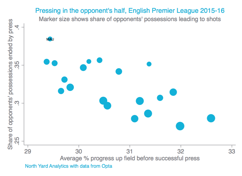 На дистанции первой половины сезона «Юнайтед» – самая эффективная в плане прессинга команда АПЛ. Почти 40% завладеваний мячом соперниками они прерывают на чужой половине поля, при этом занимают вторую позицию по «высоте прессинга». Данные по итогам 15 туров: