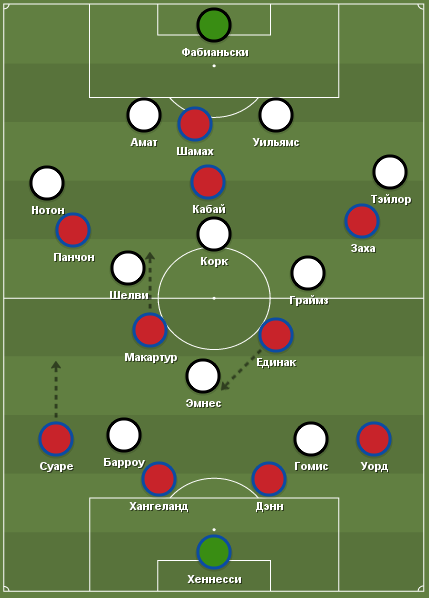 Лондонцы активно прессинговали, также выстраиваясь ромбом – Шамах играл по Корку, Панчон и Заха встречали центральных защитников, а Кабай опускался чуть ниже, помогая центру полузащиты. В итоге, валлийцев выжимали во фланг и заставляли играть длинными передачами, зацепиться за которые нападающие гостей не могли. Неважно выглядел и центр поля «Суонси» – слишком широкое расположение полузащитников не способствовало взаимной поддержке, контролю мяча и выходу из-под прессинга через мелкий пас, а Эмнес поднимался высоко, в линию нападения, и никак не помогал связывать линии. Лишь дважды за тайм гости сумели выйти из-под прессинга соперника и провести быстрые атаки, но этого было очень мало, да и на ход игры никак не влияло.