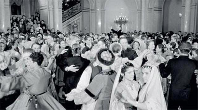 Учащиеся ПТУ пришли на кремлевский новогодний праздник в национальных костюмах. Даже лестница плотно забита! 1955 год.