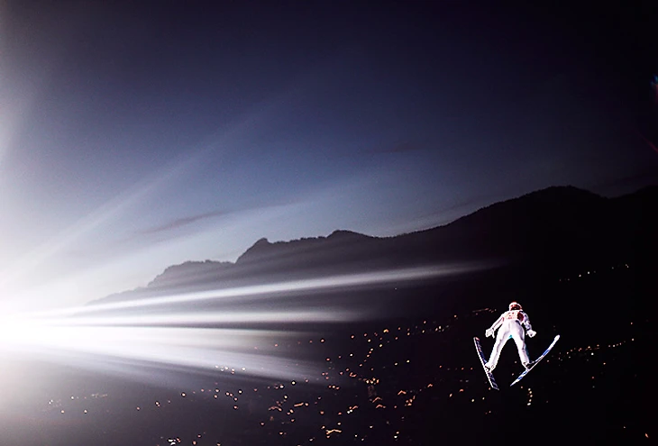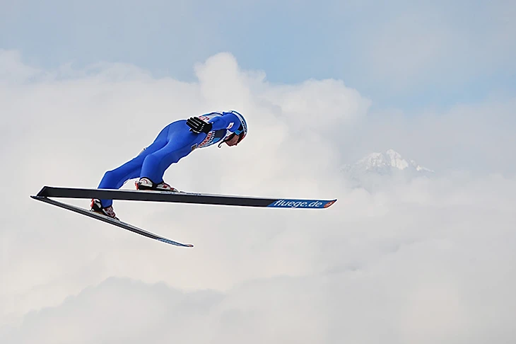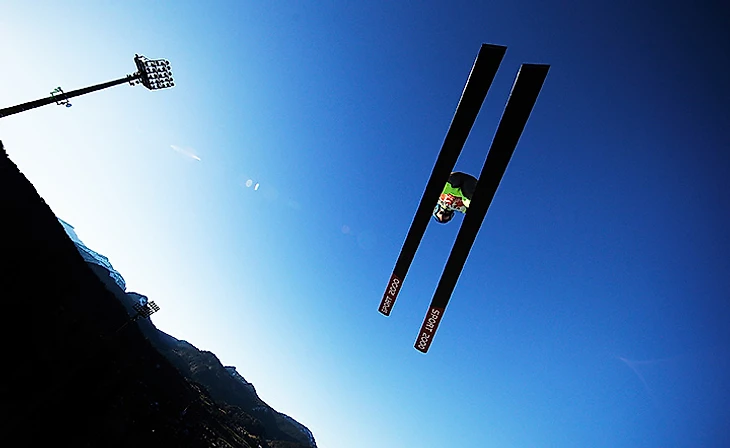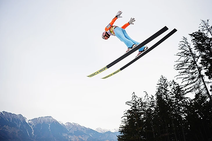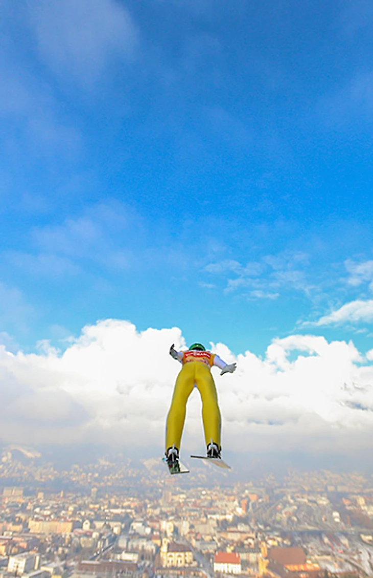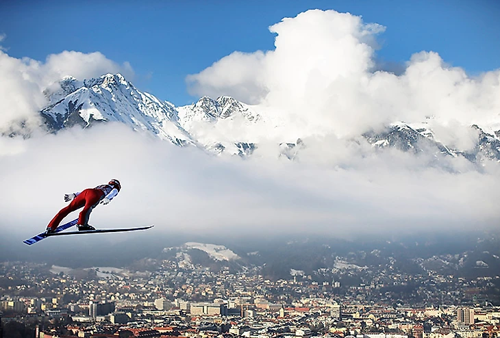 Инсбрук. Местный герой Штефан Крафт взымыл над Альпами и над хвойными.