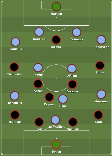 «Вест Хэму», также испытывающему перманентные трудности в игроками атаки, пришлось менять выбывшего из-за травмы бедра Мануэля Лансини на наконец готового играть с первых минут Димитри Пайе. С Кэрроллом, Валенсией и Антонио он составил группу атаки. Кроме того, повреждение получил и Шейху Куяте, которого в старте заменил молодой и обычно выходящий на замену Педро Обиянг. Он занял место в центре поля рядом с Марком Ноблом. Но не прошло и 10 минут матча, как гостям вновь пришлось перекраивать состав – из-за травмы поле покинул Энди Кэрролл, и его уход во многом определил развитие событий в первом тайме.