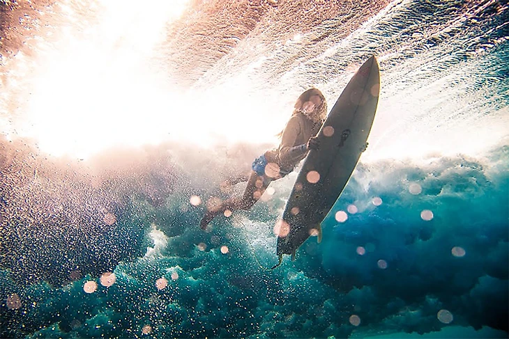– Это про водную съемку, когда снимаешь из бокса, прямо из воды, не с лодки и не с берега. Я раньше думал, что съемка серфинга – самая безопасная вещь: ты стоишь на пляже, светит солнышко, можно коктейль заказать и спокойно с большим объективом снимать. На самом деле можно снимать из воды и тут возникает много опасностей: течение, большие волны, акулы. Главное не паниковать и просто выбираться оттуда. Как говорит мой друг, просто плыви.