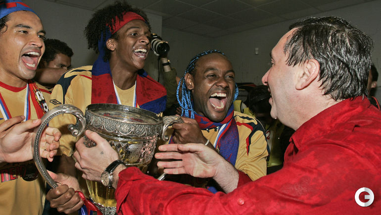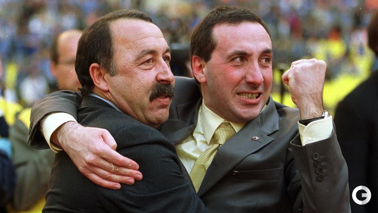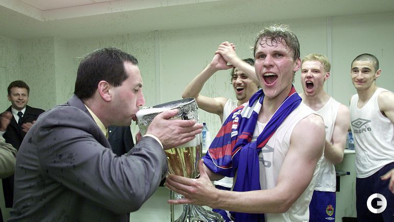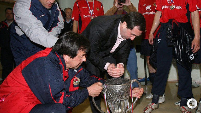 2002 год. Евгений ГИНЕР (справа) вместе с главным тренером ЦСКА Валерием ГАЗЗАЕВЫМ празднует первый крупный успех армейцев в 21 веке - победу в Кубке России. В финале со счетом 2:0 обыгран "Зенит". Фото Александр ВИЛЬФ