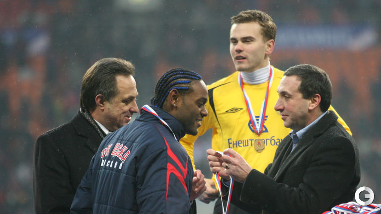 2006 год. Евгений ГИНЕР (справа) награждает футболистов ЦСКА после победы в Суперкубке над "Спартаком" - 3:2. Медаль принимает ВАГНЕР ЛАВ (в центре). Фото Александр ВИЛЬФ
