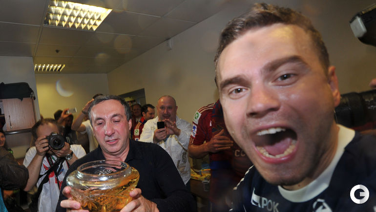 2014 год. Евгений ГИНЕР (слева) и голкипер ЦСКА Игорь АКИНФЕЕВ празднуют второе подряд чемпионство армейцев. Фото Александр ФЕДОРОВ, "СЭ"