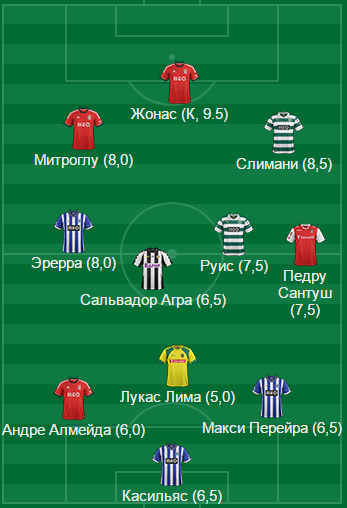 Андре Алмейду (6,0), Элизеу (6,5), Макси Перейра (6,5), Маркано(6,0), Лукас Лима (5,0).