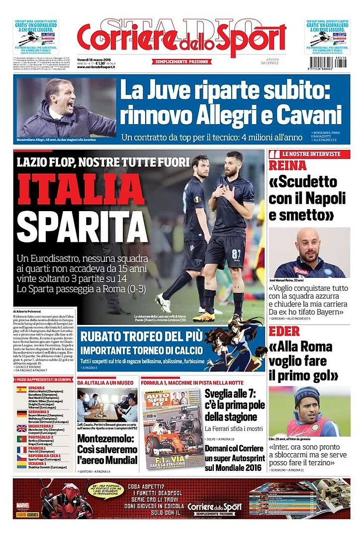 «Лацио» проиграл, все наши команды вылетели. Евроразочарование, ни одна команда не прошла в четвертьфинал: такого не случалось в течение 15 лет. Выиграно только 3 матча из 14. «Спарта» прошла дальше в Риме (0:3).