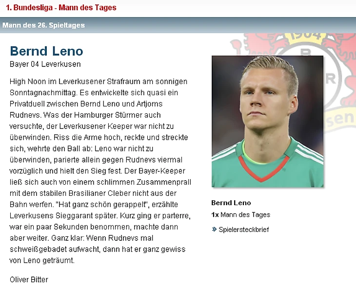 К слову, просто роскошный матч провел в субботу Бернд Лено. Болельщики «Байера», пожалуй, легко простили ему все прошлые пригрешения за несколько по-настоящему феноменальных сэйвов.