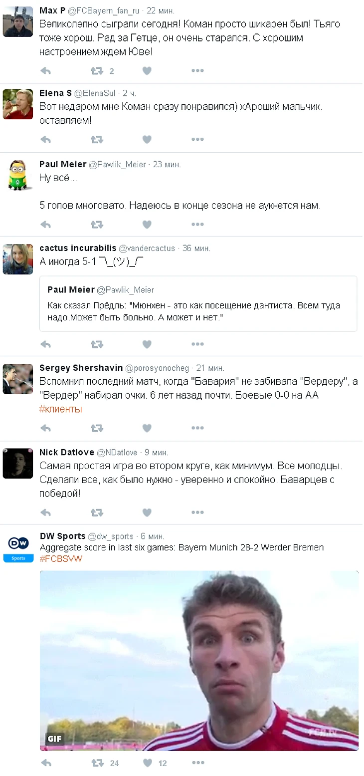 «Бавария» же, которая во втором круге показывает не самый свой лучший футбол, спокойно расправилась с «Вердером». Бременцы не особо сопротивлялись хозяевам, нанеся по их воротам лишь 2 удара за весь матч. Хотя, впрочем, это еще прогресс – в прошлый свой вояж в Мюнхен бременцы не сумели нанести ни одного вообще. Всю опасность, которую «музыканты» в этой встрече представляли для чужих ворот, идеально опишет этот крдр.