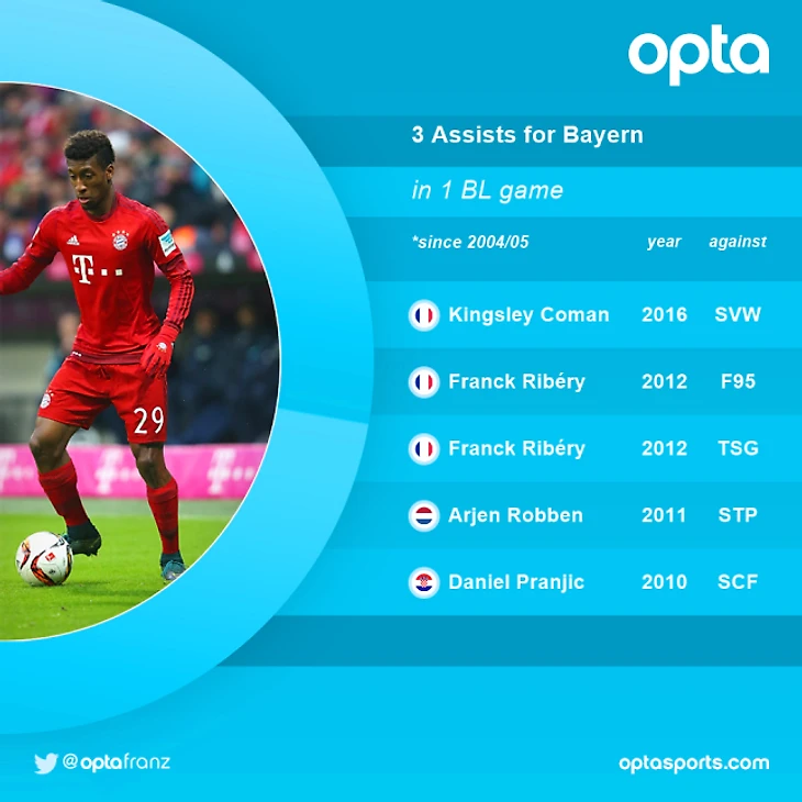 Коман стал первым игроком «Баварии», отдавшим 3 голевых передачи в одной игре, после Франка Рибери, сотворившего такое в октябре 2012 года.