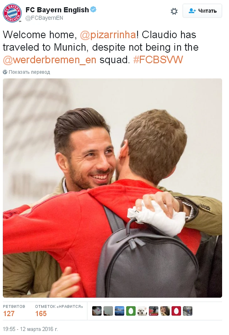 Впрочем, пока баварцы еще позволяют себе ненадолго оглянуться назад и поприветствовать старого друга. Клаудио Писарро приехал в Мюнхен даже несмотря на больничный, оставивший его вне заявки на матч, специально, чтобы повидаться с бывшими одноклубниками.