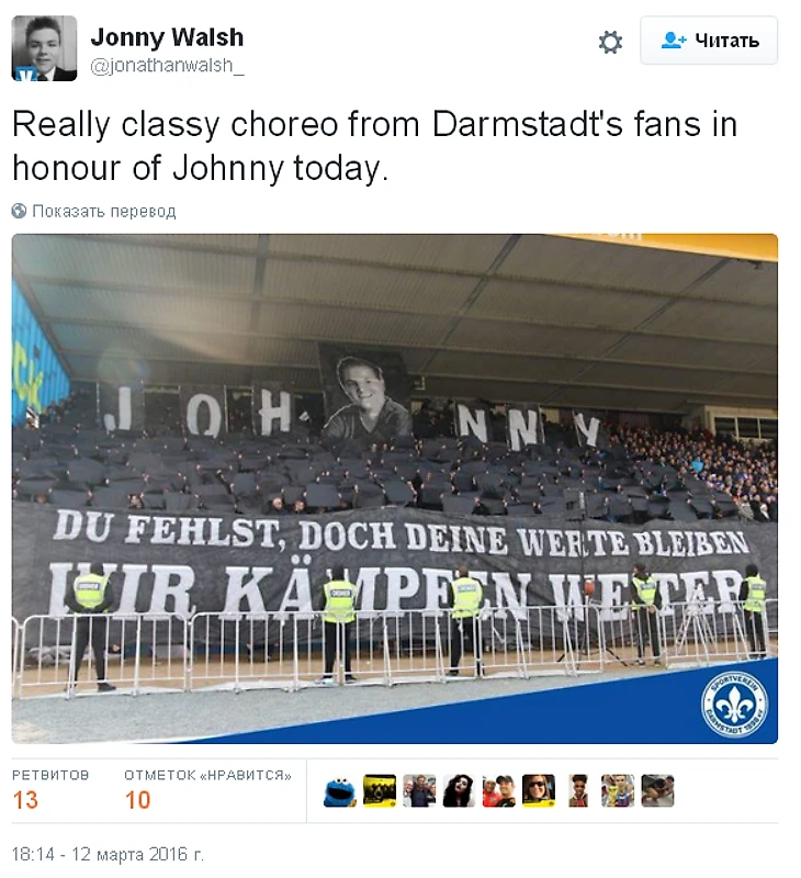 Остается лишь добавить, что такие истории по всем законам жанра просто должны заканчиваться хэппи-эндом. Однако жизнь иногда – слишком жестокий сценарист. Шесть дней назад Джонни умер. Именно поэтому в субботу матч на «Белленфальторе» проходил в его честь. И перформанс болельщиков «лилий» не мог не заставить сжаться сердце каждого, кто знает эту историю. «Du fehlst» можно перевести как «я по тебе скучаю» или «тебя не хватает», но здесь уместнее дословный перевод: «Тебя нет, но твои ценности остаются. Мы по-прежнему боремся».