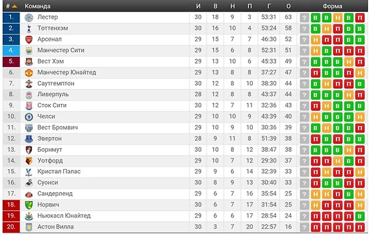 Чудо-Лестер держится на своем первом месте с 5-ти очковым отрывом от Тоттенхэма, Арсенал все ближе к своему любимому четвертому месту, Ман Сити хромает, Вест Хэм всерьез решил побороться за зону Лиги Чемпионов, Ливерпуль набирает ход, имея два матча в запасе, Челси все не проигрывает, Вест Бромвич и Борнмут очнулись, а внизу Норвич, Ньюкасл и Сандерленд борются за прописку в элите