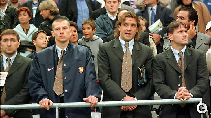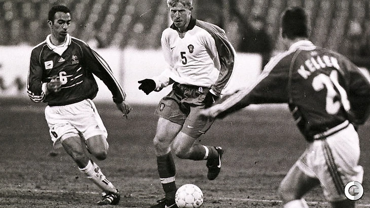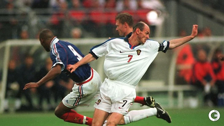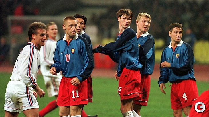 10 октября 1998. Москва. Россия - Франция - 2:3. "Стенка" сборной России Андрей ТИХОНОВ, Александр МОСТОВОЙ, Егор ТИТОВ, Владимир БЕСЧАСТНЫХ, Дмитрий АЛЕНИЧЕВ и будущий главный тренер французов Дидье ДЕШАМ (слева). Фото Дмитрий СОЛНЦЕВ