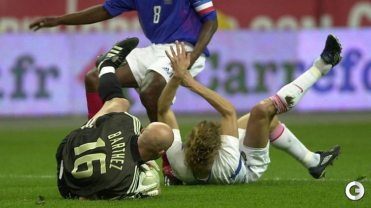 17 апреля 2002. Париж. Франция - Россия - 0:0. Валерий КАРПИН у ворот Фабьена БАРТЕЗА. Фото REUTERS
