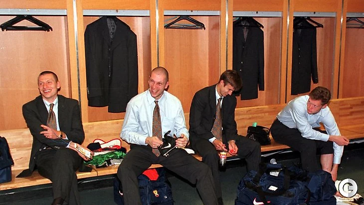 5 июня 1999. Париж. Франция - Россия - 2:3. В раздевалке после матча Александр ШИРКО, Александр ФИЛИМОНОВ, Сергей СЕМАК, Евгений ВАРЛАМОВ. Фото Сергей КИВРИН