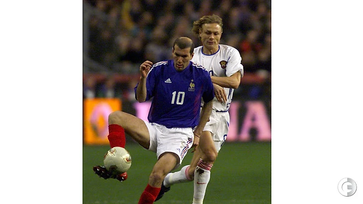 17 апреля 2002. Париж. Франция - Россия - 0:0. Зинедин ЗИДАН и Валерий КАРПИН. Фото REUTERS