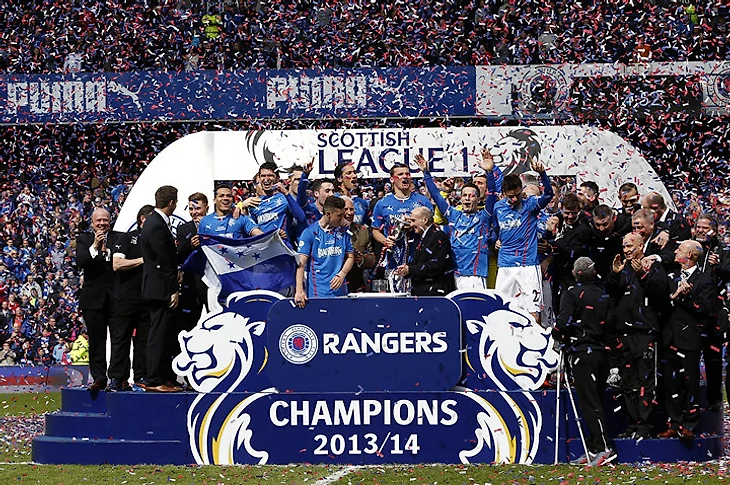 В матче 33-го тура чемпион-лиги клуб из Глазго на глазах у 48 568 болельщиков одержал победу над "Дамбаротном" (1:0) и досрочно занял первое место в таблице, тем самым клуб обеспечил себе возвращение в высшее национальное общество после того, как летом 2012 года покинул его «волей» нечистых на руку владельцев. «Рейнджерс» оторвался от ближайшего преследователя 17 очков за 4 тура до финиша чемпион-лиги и официально вернулся в элитный дивизион, закончив 4-летнее путешествие по низшим Шотландским лигам.