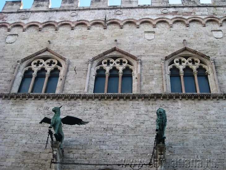 Перуджа даже во мраке среднековья сумела показать свой свободолюбивый нрав: зубцы по периметру крыши как раз есть символ независимости города, а не антураж оборонительной крепости. С консолей, на которых восседают грифон и лев, свисают обрывки цепей - еще одно свидетельство боевого духа Перуджи. По преданию, на цепях висели ключи от ворот города Сиены, которые надменные перуджинцы забрали с собой после победы над сиенцам.