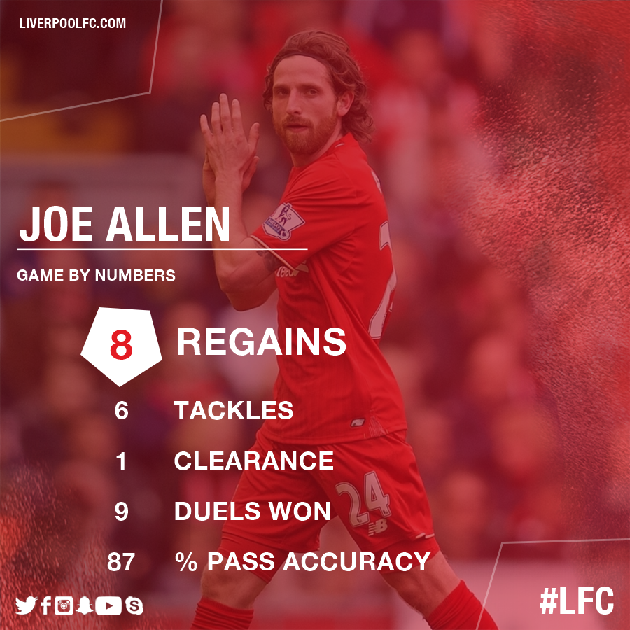 Отметим дуэт Аллена и Стюарта в центре, который отлично себя показал. Сочетание отличной игры в пас и правильного движения игроков, дало «Ливерпулю» преимущество в быстром развитие атак, не застревая при этом в центре поля или на подступах к штрафной. Стюарт очень молод, но в матче сыграл зрело, без ошибок и привозов. Аллен теперь точно игрок стартового состава и это значит, что физической мощи у команды стало меньше, а конструктивной игры и контроля мяча больше. Однозначный плюс к атаке.