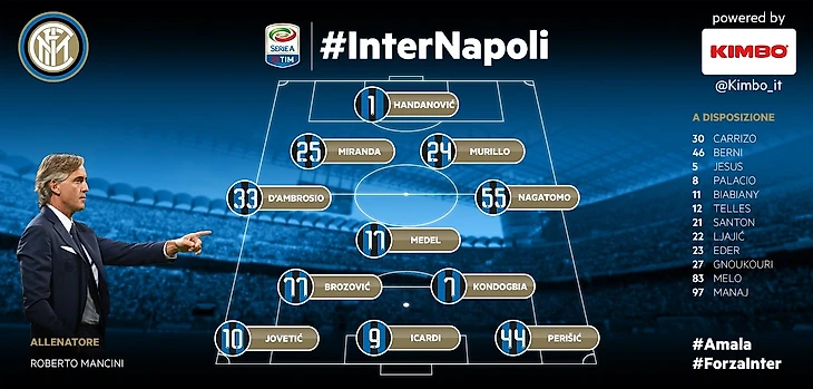 На матче 33-го тура Серии А сезона 2015/2016 против «Наполи внутри 60-тысячного «Меацца» царила атмосфера праздника. Манчини выбрал схему 4-3-3 с Д’Амброзио, Мирандой, Мурильо и Нагатомо в защите перед Хандановичем. Брозович, Медель и Кондогбиа составили крепкое трио в полузащите, с Икарди, Перишичем и Йоветичем в линии нападения.