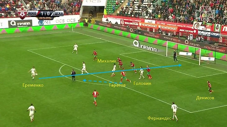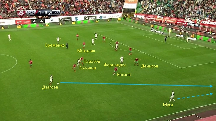 Дело в том, что на левом фланге обороны «Локо» Денисов играл не против крайнего игрока группы атаки «ЦСКА», как достаточно часто практикуется в современном футболе, а против латераля Марио Фернандеса. В то время как Тошича, любящего смещаться в центральную зону с фланга, по задумке наставника железнодорожников, должен был закрывать полузащитник Касаев, с чем он, надо сказать, с успехом и справился. На противоположном фланге наблюдалась обратная картина - Пейчинович играл с крайним нападающим Мусой, а Самедов противостоял Набабкину.