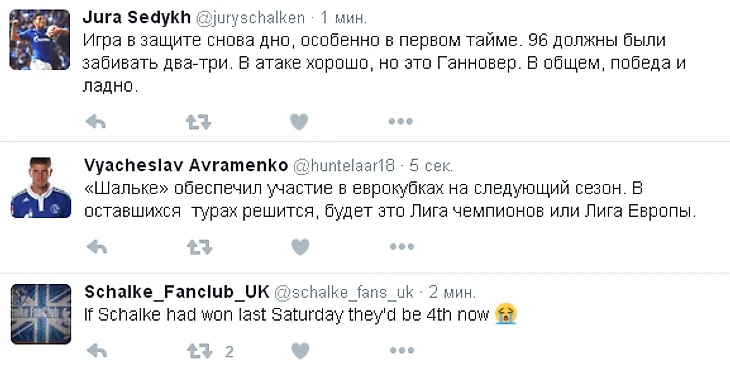 Последние туры обещают быть жаркими, но самое опасное для команды - потерять веру и решить удовлетвориться Лигой Европы. Главному конкуренту (Гладбаху) в следующем туре играть дома с уже немотивированным Леверкузеном, и вполне вероятно отставание в самом лучшем случае останется таким же. Однако не стоит забывать, что «Дармштадт», в гостях у которого Гладбаху играть в последний игровой день, тоже умеет кусаться. Поэтому гельзенкирхенцам стоит продолжать держать врага в напряжении. При должном старании может и получиться. Тем более, с такой поддержкой болельщиков, которых в Ганновер, например, приехало 10 000 человек.