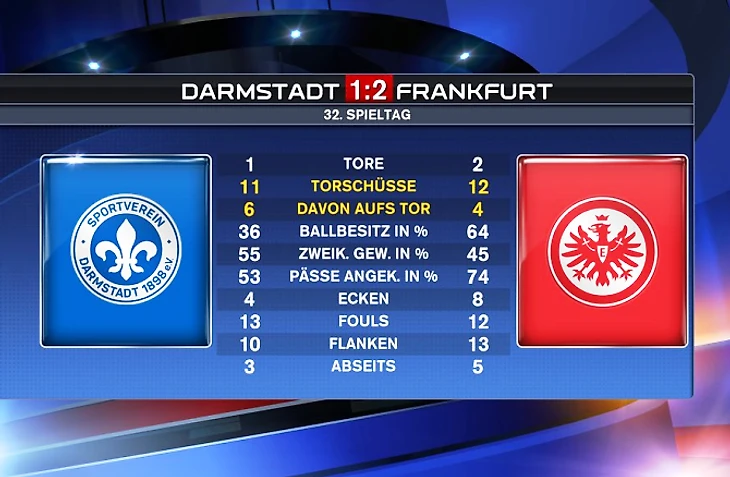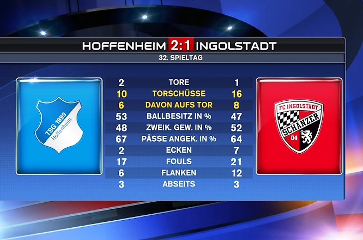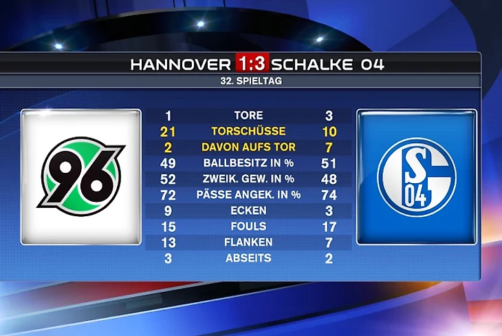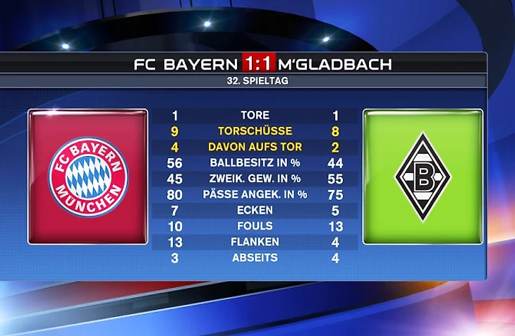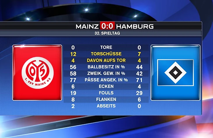 *tore – голы, torschüsse – удары по воротам, ballbesitz – владение мячом, zweik. gew. – выигранные единоборства, pässe angek. – точность передач, ecken – угловые, fouls – фолы, flanken – вводы из-за боковой, abseits – офсайды.