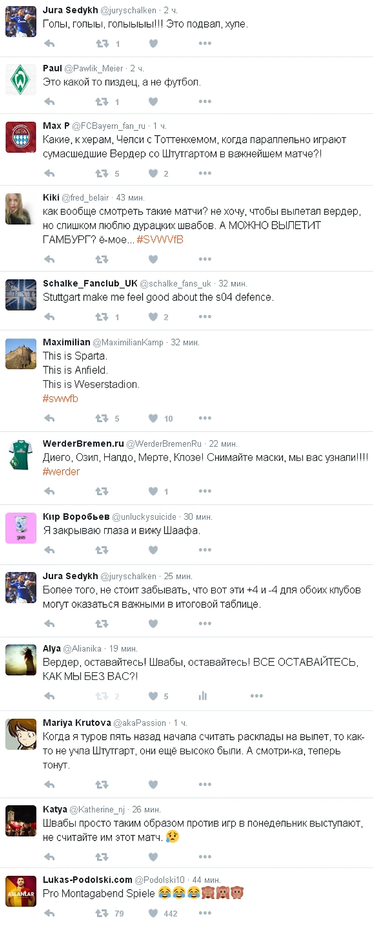 Оживили вечер нерабочего понедельника «Штутгарт» с «Вердером», так что после 32-го тура, вынося за скобки уже обреченный «Ганновер», подвал таблицы выглядит так: на 17 место свалился «Штутгарт», на стыковом 16-м – «Айнтрахт», обходящий швабов всего лишь по дополнительным показателям. У «Вердера» на одно очко больше, и «музыканты» могут насладиться местом вне зоны вылета – после такой победы оно выглядит заслуженным.
