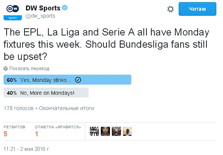 А вечером, пока игроки «Лестера» смотрели матч «Челси» с «Тоттенхэмом», а позже и праздновали чемпионство дома у Джейми Варди, в Германии «Штутгарт» и «Вердер» встречались друг с другом вот уже в сотый раз. И юбилейное противостояние этих команд вполне могло уложиться всего в три слова: «матч в понедельник», против которых так яро протестовали и продолжают протестовать фанаты. В самом деле, событие экстраординарное, доселе непривычное для Бундеслиги – пусть даже пока оно случилось не из-за нового расписания, которое еще нескоро вступит в силу, а лишь из-за праздничного дня. И все же DeutscheWelle поинтересовался у почтенной публики ее отношением.