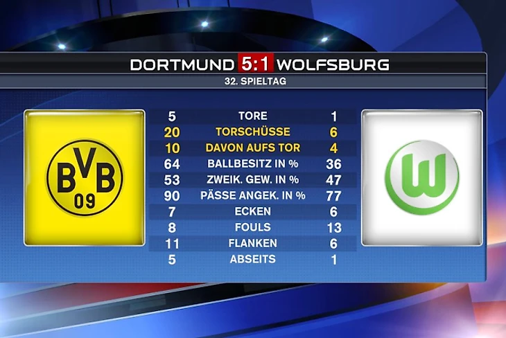 В целом, матч прошел на одном дыхании. Дортмунд чувствовал себя комфортно и показывал свой блестящий атакующий футбол. «Вольфсбург» же казался беспомощным, слабым. Мелкие ошибки, неудачные попытки выйти из обороны в атаку, неспособность противодействовать атакующей линии соперника. Все это помогло Дортмунду сделать положительный для себя результат. Примечательно, что в этом матче «Боруссия» забила в ворота «Вольфсбурга» самое большое количество мячей за всю историю этого противостояния. Также этот матч стал одним из самых результативных в истории встреч этих команд.