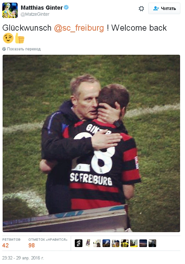 Безумствовали и болельщики рядом со стадионом, сумев отлично помочь репортеру Sky передать весь антураж и атмосферу на прямом включении. Впрочем, возвращаясь к теплому отношению Бундеслиги к «Фрайбургу», радовались за них далеко не только их фанаты. Например, «Майнц»с «Хоффенхаймом» и даже Матиас Гинтер, помня вечное «никогда не забывай, откуда ты пришел».
