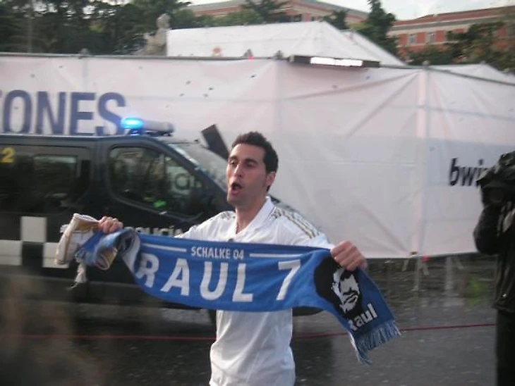 По дороге на Сибелес праздновать чемпионство Ла Лиги с шарфом Рауля! Помнит батьку...