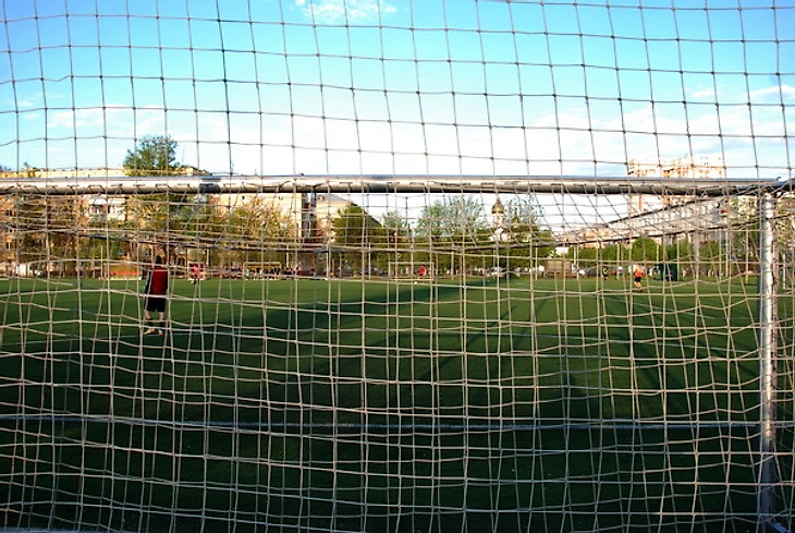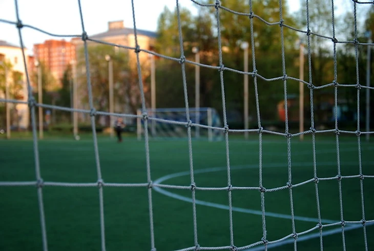 Главный недостаток стадиона заключается в том, что поле со всех сторон увешано высокими тканевыми сетками. Что очень сильно мешает смотреть футбол – рябит в глазах. Все в клеточку. Вид вызывающе некрасивый. Понятно, зачем ставить сетку за воротами – чтобы мяч не улетал. Но зачем сетка вдоль поля – непонятно. Вылетающие за боковую линию высокие мячи (пару раз за матч такое было) хорошо улавливает сетка за трибуной. А вот зачем сетка между трибуной и полем – непонятно. Если она призвана удержать болельщиков от выбегания на поле, то это очень странный замысел: желающие выбежать выбегут очень легко, просто подняв сетку руками (она ничем не закреплена снизу). Получается, что единственный смысл сетки вдоль трибуны – это мешать нормальному просмотру футбола. Ну ок.