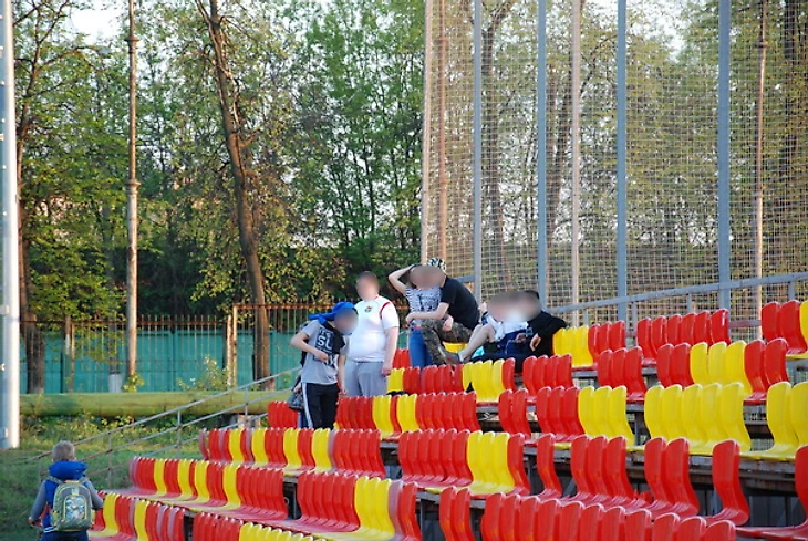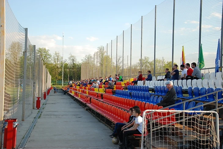 Стадион небольшой, с одной трибуной примерно на 1200 зрителей. Трибуна тянется вдоль западной боковой линии поля – это очень правильное решение, Солнце во время вечерних матчей не мешает зрителям наблюдать то, что происходит на поле (в смысле, футбол).