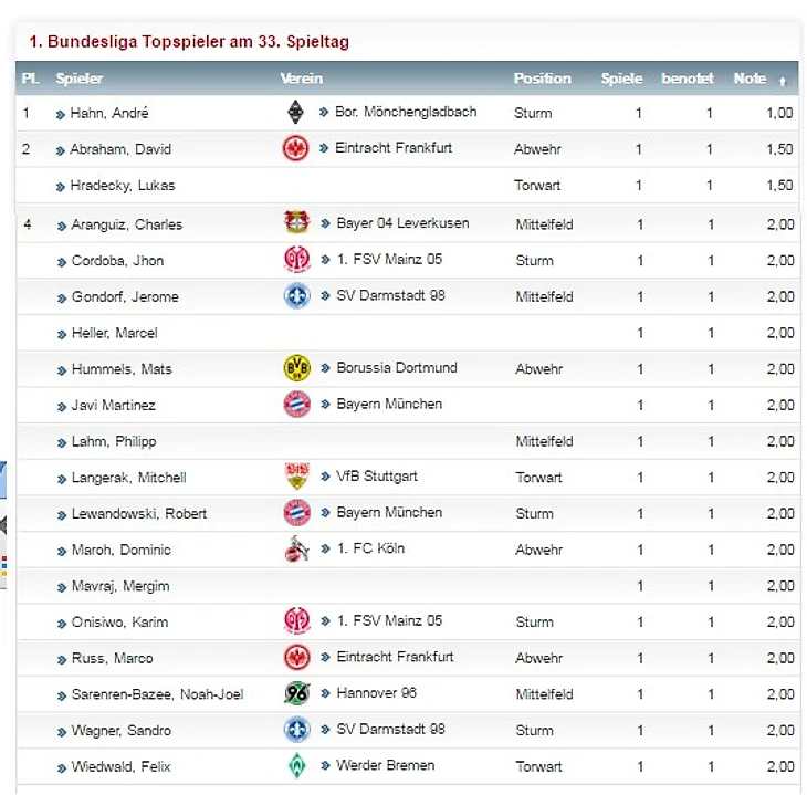 Благодаря волевой победе над уже обеспечившим себе бронзу чемпионата «Байером» менхенгладбахская «Боруссия» практически обеспечила себе место в лигочемпионской четверке. Из преследователей «жеребцов» в туре удалось одержать победу только «Майнцу», таким образом «Боруссия» опережает «карнавальщиков», «Герту» и «Шальке» на три очка перед финальным туром, имея комфортное преимущество в разнице мячей. Героем дня в Менхенгладбахе стал Андре Хан, забивший дубль в этой важнейшей для «жеребцов» встрече.
