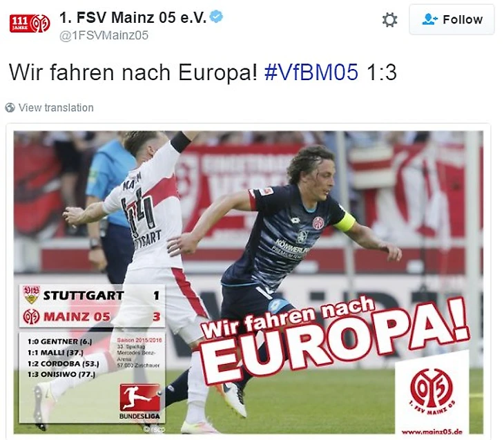Уверенная победа со счётом 1-3 оставляет теоретические шансы подвинуть «Гладбах» с четвертой строчки, и побороться в следующем сезоне за ЛЧ. И это при том, что последние 4 тура «Майнц» не смог одержать ни одной победы. С 2011-го года это первый раз, когда «карнавальщики» выигрывают свою последнюю выездную встречу. Пропустив на первых минутах матча, команда Шмидта не растерялась, и показала всю свою мотивацию. Сначала Малли, а после Кордоба и Онисво смогли огорчить своих противников. Видимо, после непопадания в стартовый состав на прошлой неделе, Юнус Малли изучил урок и показал тренеру свое желание играть.