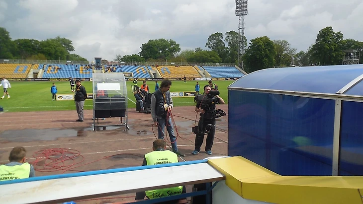 Мы проходим вдоль чашеобразной трибуны, минуем клубный автобус «Говерлы» и выходим к административному зданию. Роман, пресс-атташе «Говерлы», вручает нам с Димой аккредитации и проводит небольшую экскурсию по внутренней части арены.