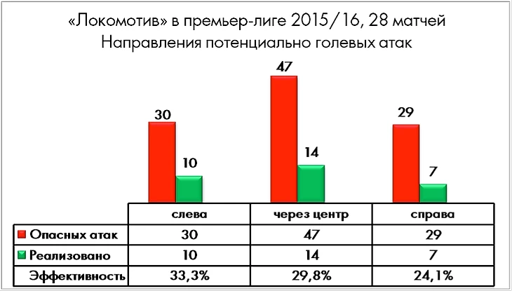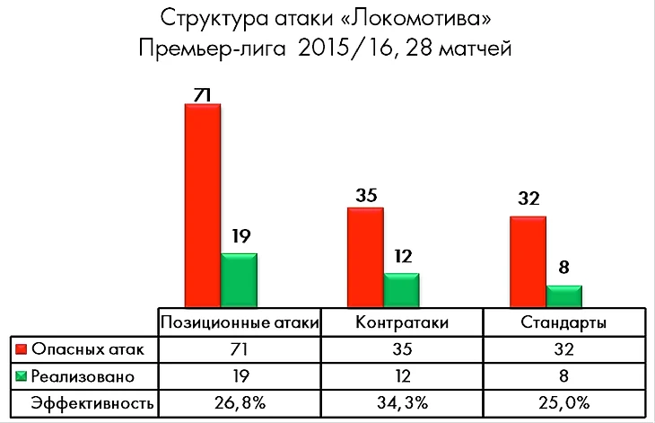 Как и у «Зенита», наиболее эффективным оружием «Локомотива» в нынешнем сезоне являются контратаки (34,3% реализации). Впрочем, по состоянию на сегодняшний день об этом можно говорить скорее в прошедшем времени, потому как после ухода Ньяссе это оружие потеряло былой блеск и остроту (только 1 забитый мяч в 9 весенних поединках).
