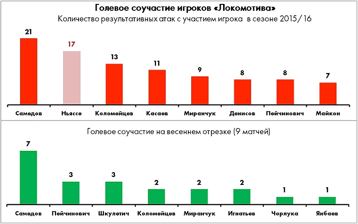 Один в поле не воин В неоднократном упоминании Самедова и Ньяссе как ключевых исполнителей, за счет отменной игры которых «Локомотив» большую часть сезона был на правильном пути, нет ничего удивительного. Голевая зависимость команды Черевченко именно от это них очень велика, и способов преодолеть ее тренеру найти так и не удалось.