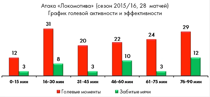 На вторую половину матча приходится сразу два ударных отрезка «Локо», первый из которых представляет особую опасность для подопечных Виллаш-Боаша. 8 из 31 голов в чемпионате были пропущены «Зенитом» именно на этом игровом промежутке, включая оба гола «Локомотива» в очном поединке первого круга.